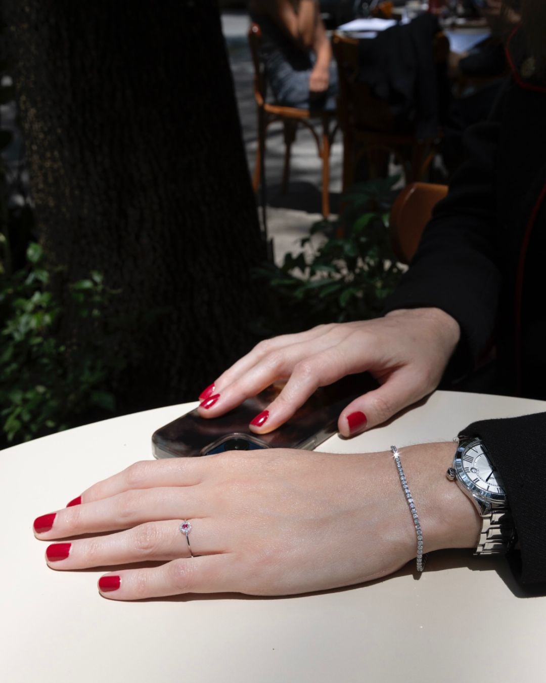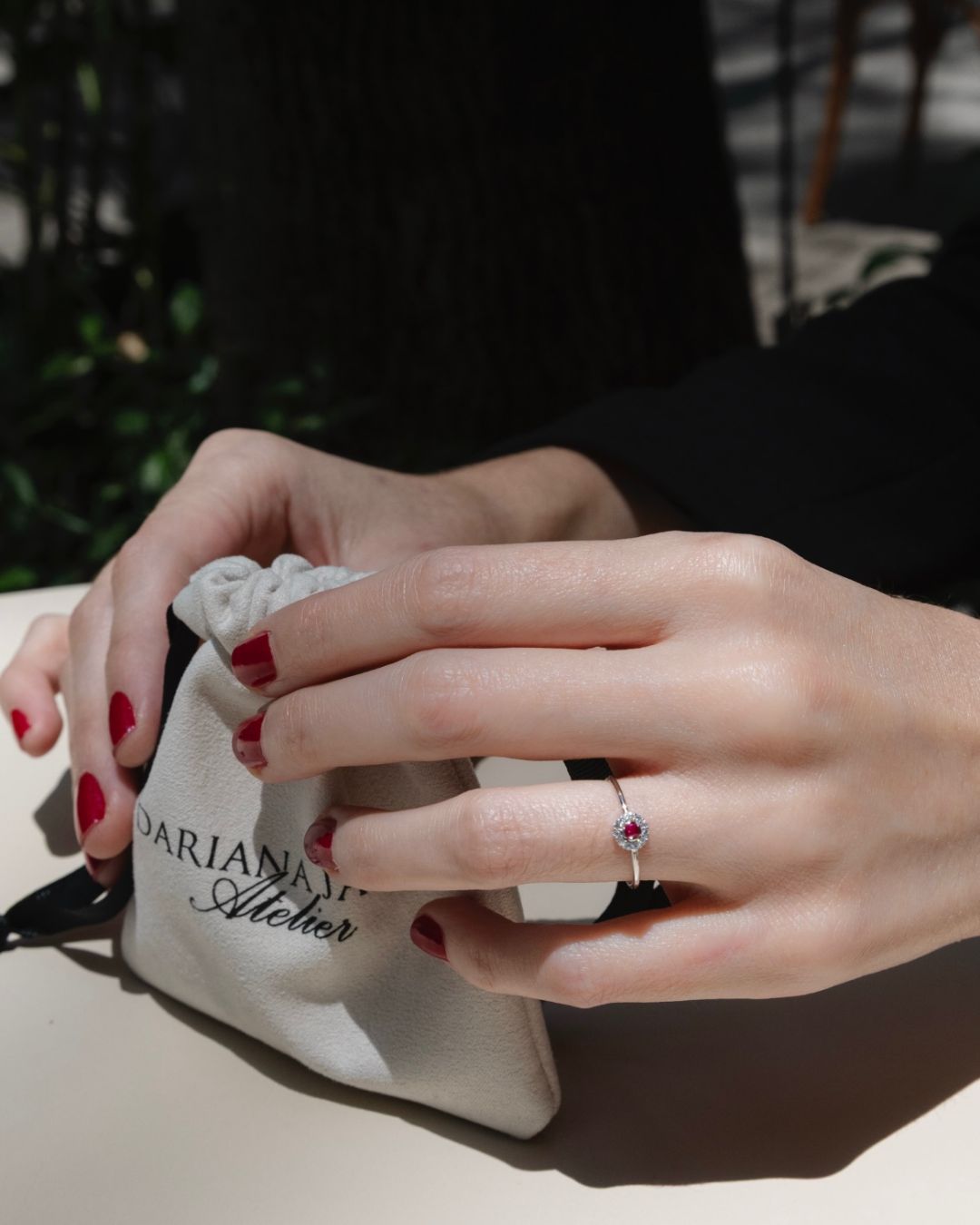 - Zirconia principal entintada en azul o verde y pequeñas zirconias que forman un halo al rededor.
